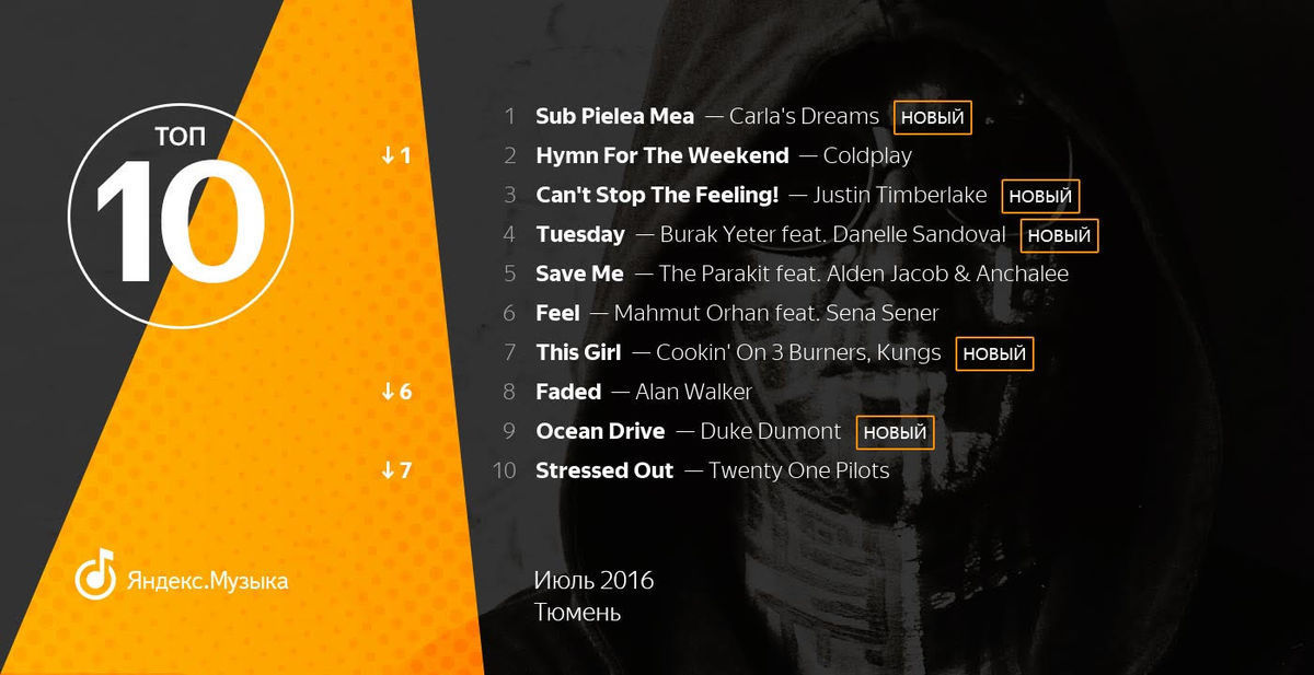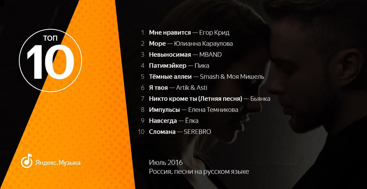 Как в Тюмени, так и в целом по стране слушатели Яндекс.Музыки отдавали предпочтение иностранным музыкантам — в июльских чартах нет ни одной композиции российских исполнителей. Из песен на русском языке ближе всех к десятке по стране оказалась «Мне нравится» Егора Крида — она стала тринадцатой.