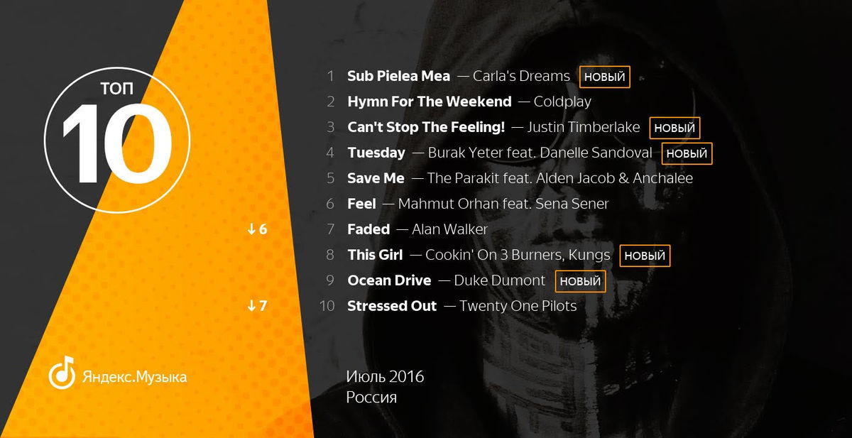 Больше, чем обычно, пользователи Яндекс.Музыки слушали La Mordidita Рики Мартина — после того как в рунете стало популярным видео итальянского бизнесмена Джанлуки Вакки с этим треком. Во второй половине месяца слушатели активно интересовались песней Кэти Перри Rise, написанной к Олимпийским летним играм в Рио-де-Жанейро. Пока в чарты она не попала, но уже стала самой популярной композицией певицы на сервисе.