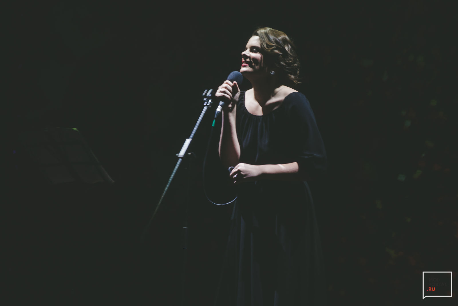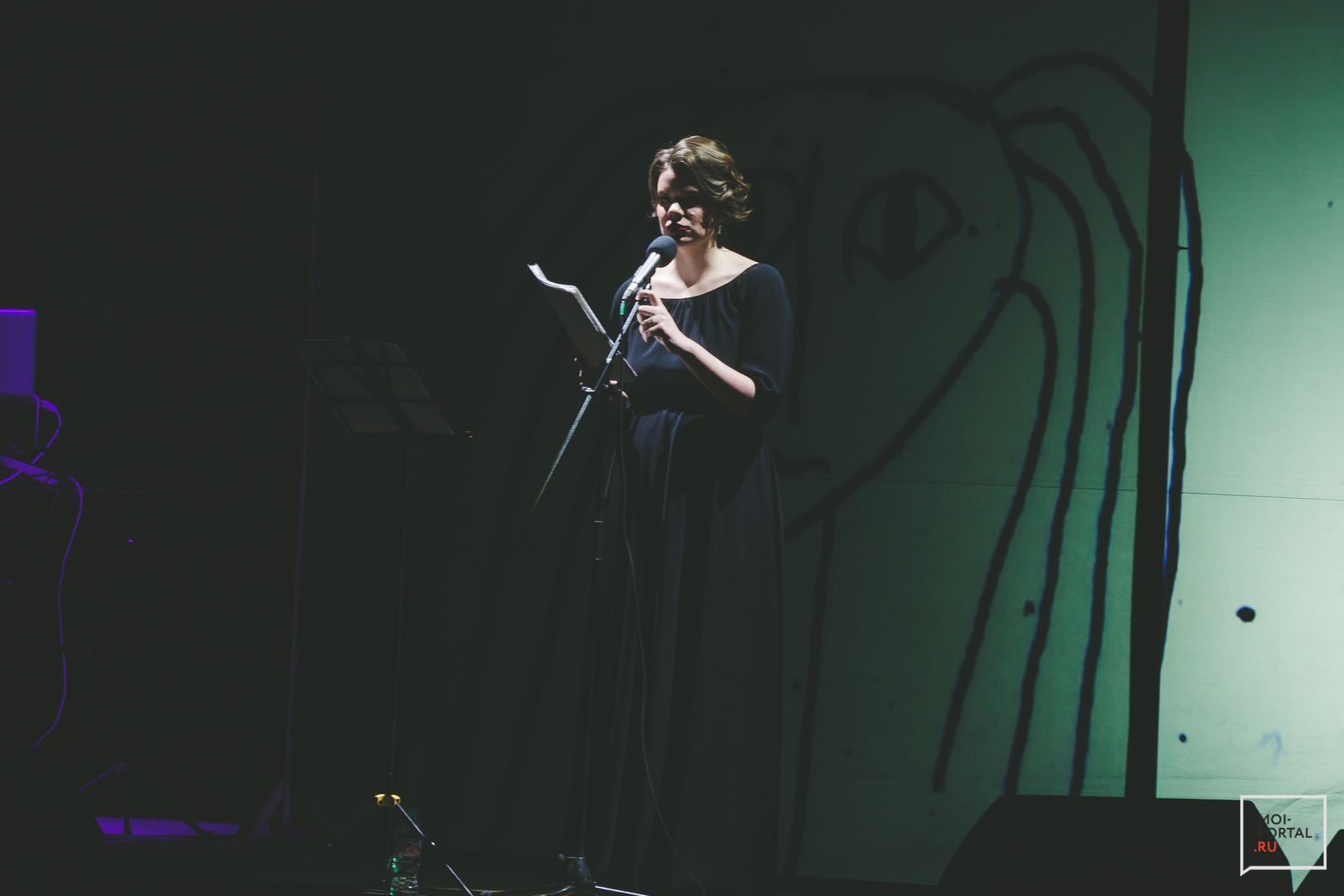 У Веры красная помада, элегантно уложены волосы и черное платье в пол с акцентом на талии. Она двигается в рамках прямоугольника, куда проецируются 3d-изображения в виде летящих букв и различной геометрии. Зрелище завораживающее: иногда кажется, что фигуры вот-вот, да и полетят к нам в зал. В основе музыки, которая сопровождает каждую рифмованную откровенность, четкий ритм, иногда смягчаемый протяжным потрескиванием бас-гитары.