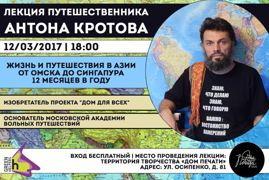 Ещё Антон Кротов ответит на вопросы присутствующих, покажет свои фотографии и книги. Вероятно, на встрече появится кто-то из местных путешественников и произойдёт обмен опытом.