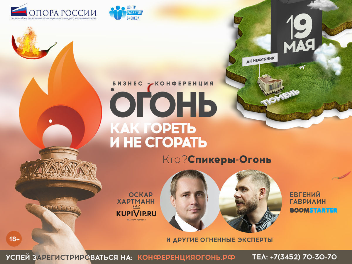 19 мая ДК Нефтяник соберет более 1000 предпринимателей и топ- менеджеров на бизнес-конференции «Огонь». О том, как гореть и не сгорать расскажут: Евгений Гаврилин - один из основателей краудфандинга в России, первым основал площадку народного финансирования Boomstarter.ru. Выступит на тему «Мотивация себя на успех». Дмитрий Пищальников - Глава ОАО «Краснокамский завод металлических сеток» (г. Краснокамск, Пермский край) увеличил производительность завода в 4 раза за счет модернизации системы управления. Тема выступления: «Как заработать в 4 раза больше». Михаил Федоренко - Кандидат экономических наук, Государственный советник 2 класса, Генеральный директор АО «Деловая среда» — dasreda.ru, дочерняя компания Сбербанка России. Автор бизнес-курсов: «Самолет – философия масштабного мышления», «Практикум масштаба», «Дольше 100 лет», и др. Выступит с темой «Глобальные мировые тренды для бизнеса»