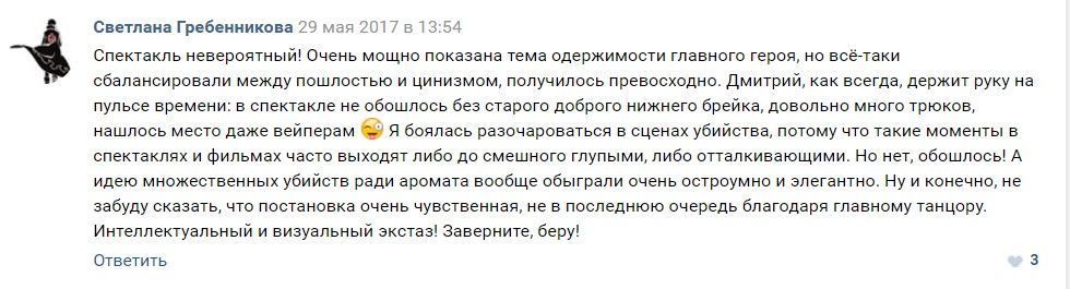 Поклонники театра не только ждали, но и активно скупали билеты на спектакль. Для того, чтобы постановку смогли увидеть все, «Парфюмера» показывали дважды в день. Сейчас, когда показы спектакля закончились, можно с уверенностью сказать, что нововведение стало оправданным. Об успехе постановки говорят отзывы тюменцев.