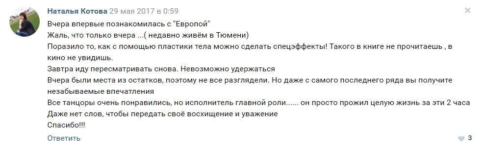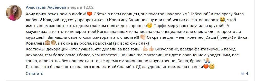 Среди зрителей были не только те, кто давно следит за постановками «Европы». Многие начали своё знакомство с театром именно с «Парфюмера». Сообщения о том, что после спектакля многим хочется увидеть другие постановки театра, появляются в группе «Европы» после каждого показа.