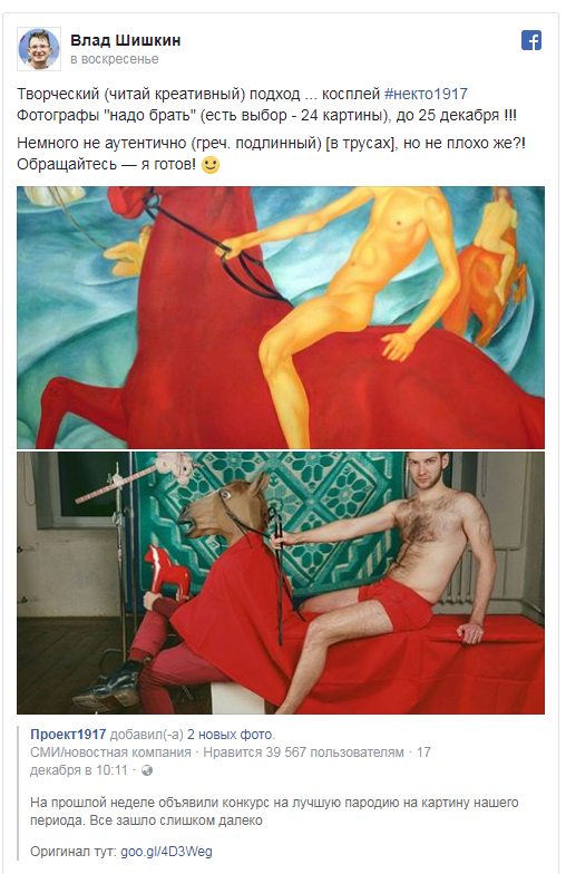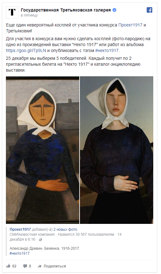 Каждый пользователь может опубликовать свою пародию на картину, представленную на выставке, под хэштегом #некто1917. Авторов самых лучших пародий определят 25 декабря.