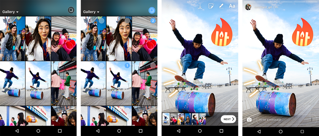 Чтобы создать галерею в Stories, пользователю нужно при выборе фотографии нажать на значок галереи, который расположен в правом верхнем углу экрана, после чего Instagram позволит выбрать до 10 фотографий и видео. Кроме этого, можно будет выбрать для галереи нужный порядок, эффект или же поставить гифки.
