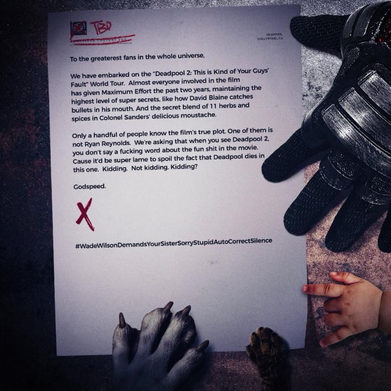 «Величайшим фанатам во вселенной, — гласит записка. — Мы начали пресс-тур картины «Дэдпул 2: Ребята, вы как бы сами виноваты». Почти все причастные к созданию фильма последние два года выкладывались на полную и всеми силами охраняли суперсекреты, вроде того, каким образом Дэвид Блейн ловит пулю зубами и что входит в секретную смесь из 11 трав и специй, благодаря которым усы Полковника Сандерса становятся столь аппетитными.