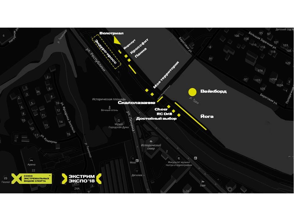 Напомним, также на набережной будут организованы соревнования по самым зрелищным видам спорта: эндуро-кросс, вейкбординг, скалолазание, RC Drift, велотриал, парашютный спорт, футбольный фристайл/PANNA, чирлиндинг, а также кроссфит и йога. С расположением площадок можно познакомиться на карте «Экстрим ЭКСПО». О том, как выглядят площадки сейчас, смотри в нашем фоторепортаже.