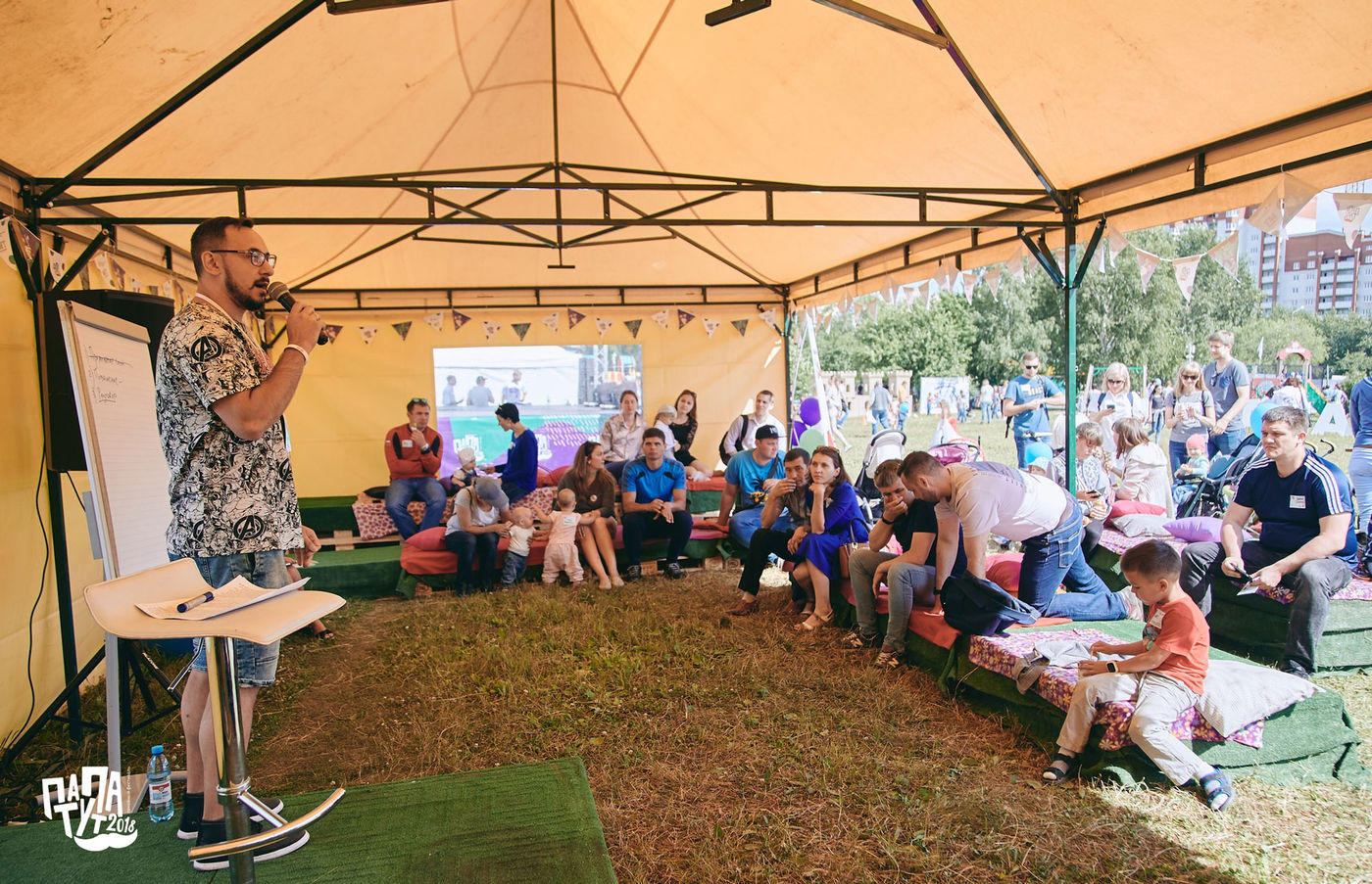 Семейный фестиваль #ПАПАТУТ проходит в Тюмени с 2016 года. В прошлом году в нем приняли участие 1500 человек (400 семей), 39 партнёров-сообществ. В этом году к фестивалю присоединились 2300 человек, 600 семей, 39 сообществ-организаторов, 56 коммерческих партнеров, один программный и 16 информационных партнеров. Фестиваль #ПАПАТУТ стал победителем первой волны конкурса Президентских грантов и получил поддержку в размере 1,7 миллиона рублей.