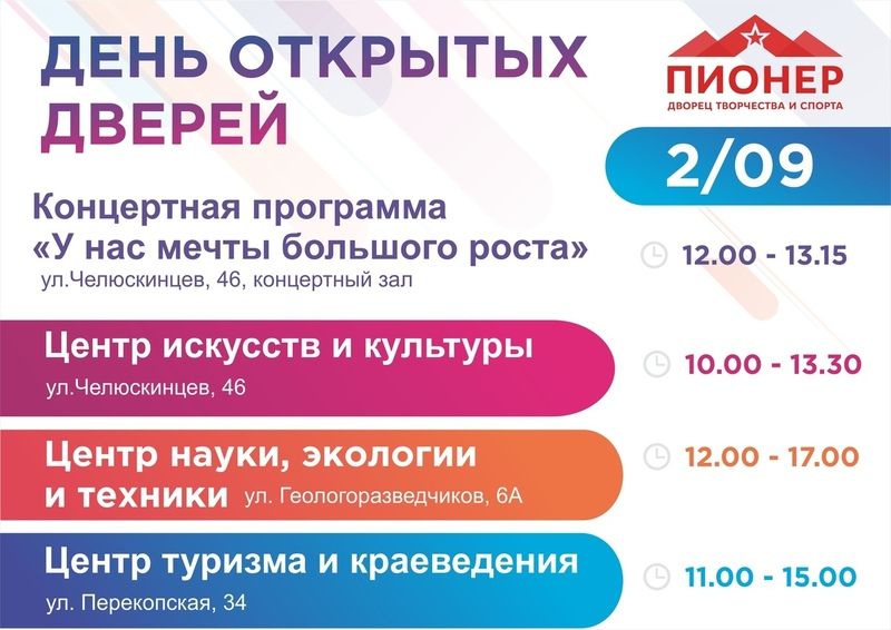 В 12:00 во Дворце «Пионер» состоится концертная программа «У нас мечты большого роста», а с 13:30 начнутся родительские собрания в коллективах.