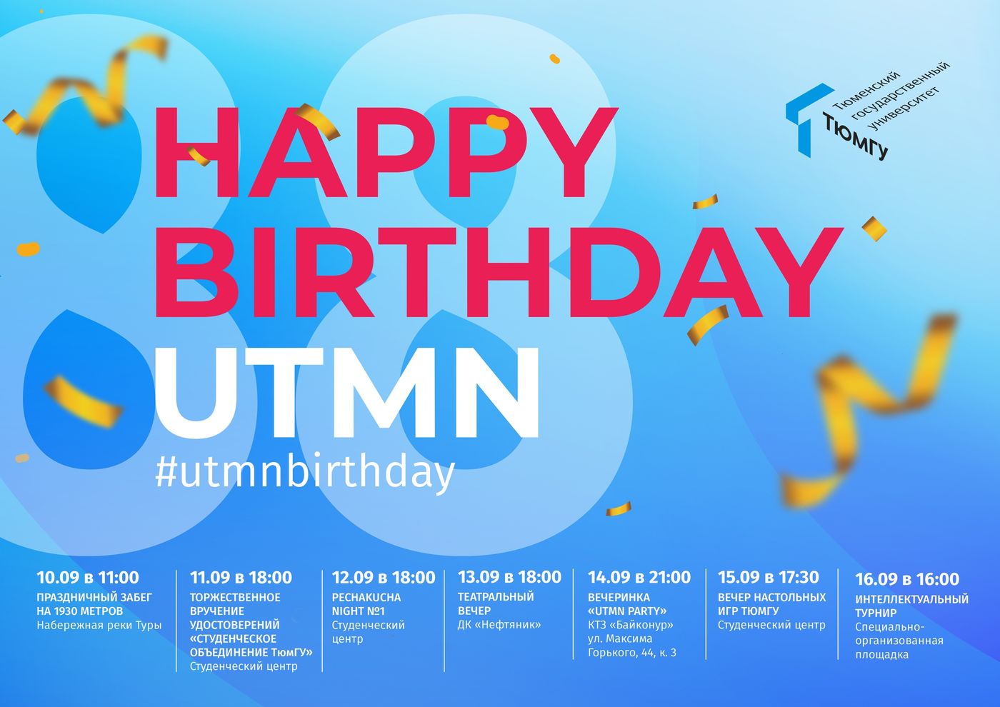 Напомним, что праздничная неделя ТюмГУ пройдет с 10 по 16 сентября. Каждый день запланированы мероприятия для студентов и горожан, среди которых:
