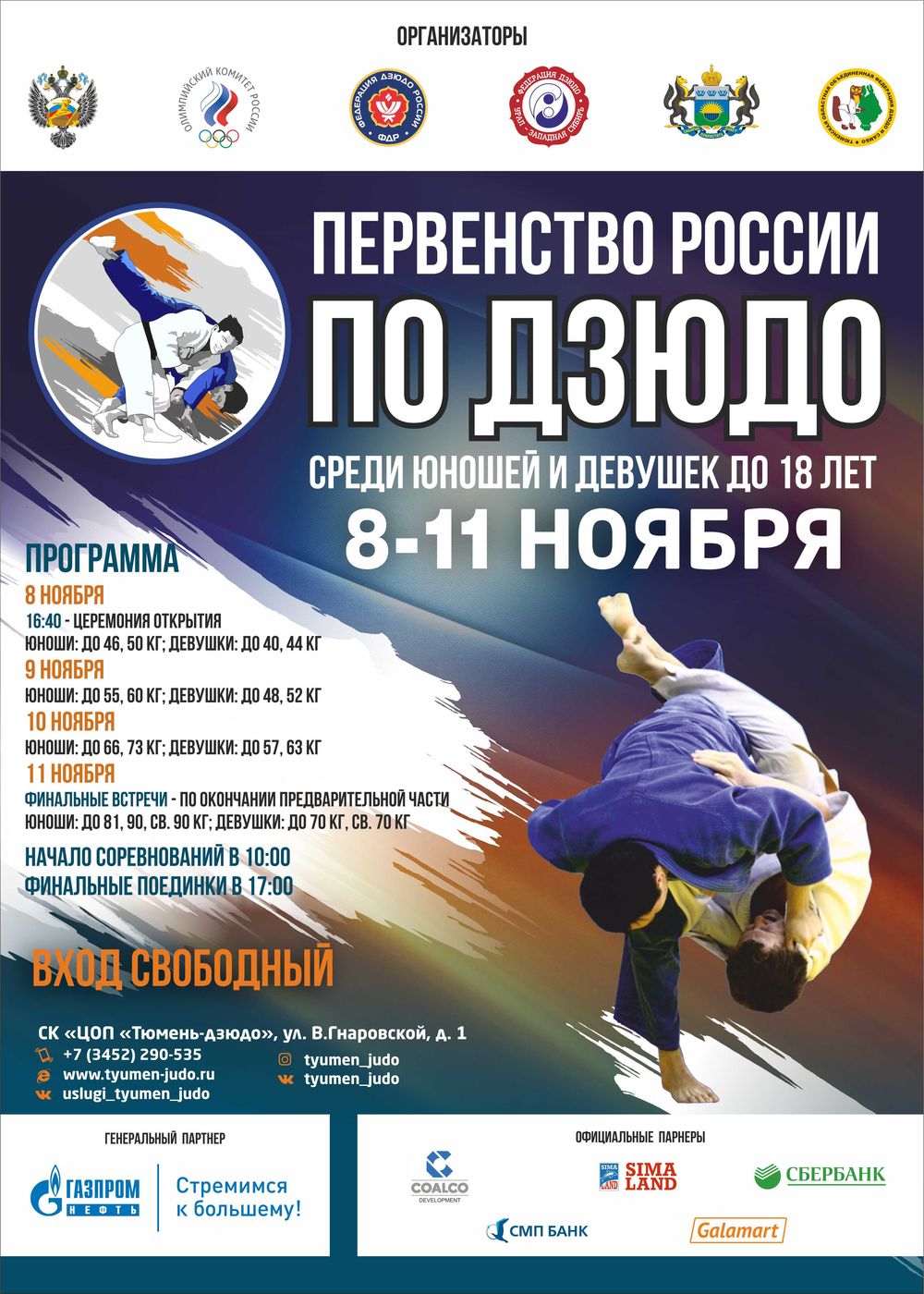 С 8 по 11 ноября 2018 года в Тюмени пройдет первенство России по дзюдо среди спортсменов 2002-2004 гг.р. Состязания пройдут в современном спортивном комплексе «Центр олимпийской подготовки «Тюмень дзюдо» (ул. В.Гнаровской, д. 1), рассчитанного на 1200 зрителей и позволяющего установить одновременно до восьми татами.