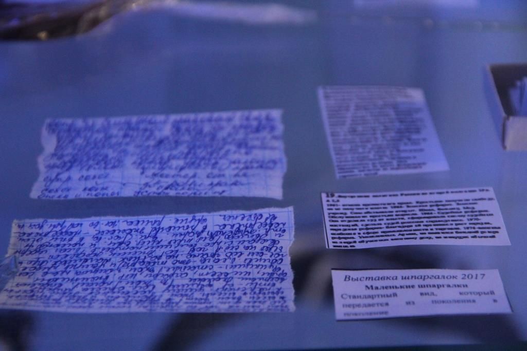 «Некоторые из экспонатов будут создаваться прямо во время самой выставки. Мы презентуем шпаргалки, работающие от человеческого тепла, продемонстрируем, как прячут маленькие бумажки, а также протестируем на реальном экзамене шпаргалки-невидимки. Кроме этого будет подготовлена специальная экспозиция, рассказывающая, как списывают студенты за пределами России», — отмечают авторы идеи.