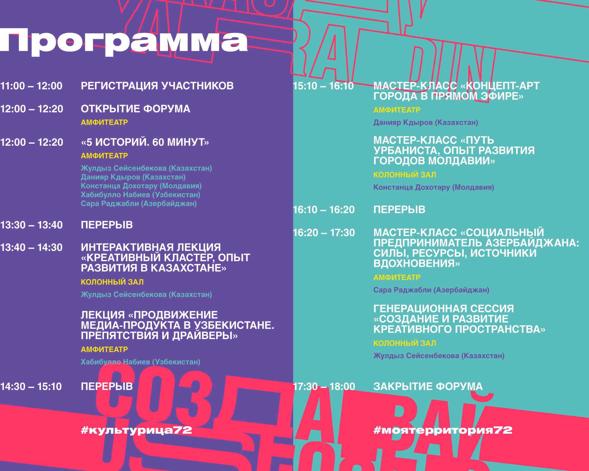 На генерационной сессии по теме «Креативные индустрии» вместе с Жулдыз Сейсенбековой из Казахстана, руководителем креативного департамента проектного офиса «Новая экономика», организатором фестиваля креативных индустрий и масштабного детского шоу-показа, участники форума поразмышляют о том, каким должно быть первое креативное пространство в Тюмени с событийным, внешним и внутренним наполнениями. А на мастер-классе Констанцы Дохотару, архитектора-урбаниста, специалиста по возрождению городов, поговорят о пути урбаниста, а также эксперт поделится опытом развития городов Молдавии.