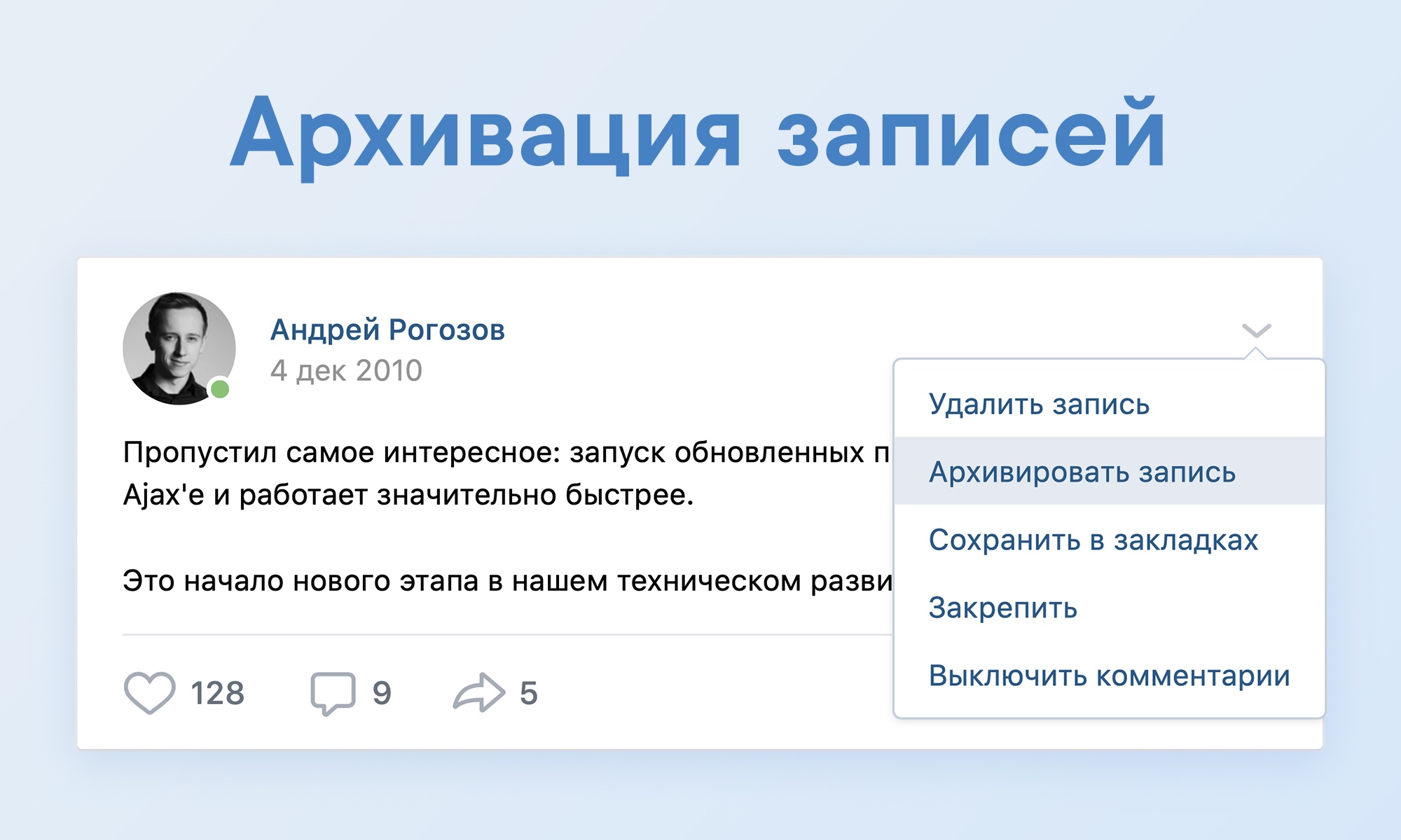 «Это удобный способ быстро скрыть неактуальные публикации со своей страницы по отдельности или за выбранный период. Теперь вместо удаления записей можно просто добавить их в архив — они будут скрыты из общего доступа и доступны только Вам», – объясняет Андрей Рогозов.