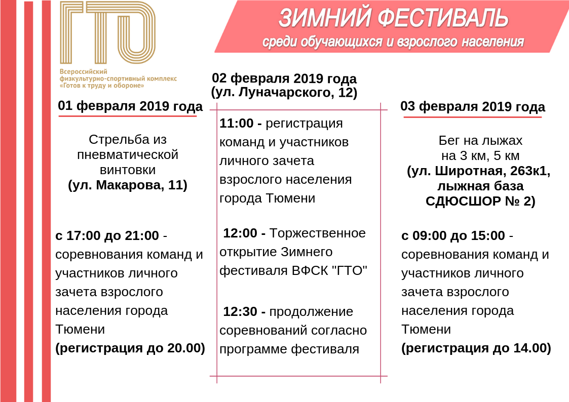 Само открытие городского этапа зимнего фестиваля «ГТО» пройдет второго февраля в 12 часов на базе легкоатлетического манежа по адресу: ул. Луначарского, 12. Торжество украсит церемония награждения тюменцев знаками отличия «ГТО».