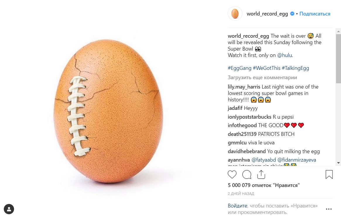 Чуть позже в аккаунте стали появляться публикации такого же яйца, только с трещинами — многие пользователи соцсети с нетерпением ждали, что же из него вылупится. Однако не так давно в аккаунте была опубликована новая фотография яйца с трещинами, зашитым на манер мяча для американского футбола.