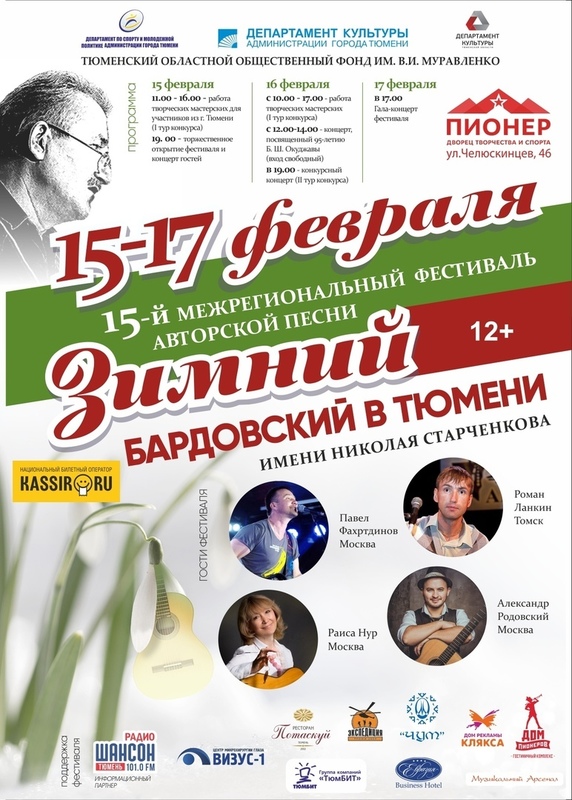 Во Дворце творчества и спорта «Пионер» встретятся участники двух возрастных категорий – до 18 и от 18 лет и старше. Конкурсанты выступят по следующим номинациям: «Исполнители песен (самостоятельный аккомпанемент; в сопровождении аккомпаниатора), «Авторы-исполнители (автор музыки и слов, автор музыки, автор слов), «Дуэты и ансамбли», «Поэзия (в конкурсе принимают участие авторы стихов, пишущие на русском языке), «Мастер» (для лауреатов всероссийских фестивалей авторской песни, профессиональных исполнителей), «Юность комсомольская моя» (песни, посвященные 100-летию Тюменского комсомола).