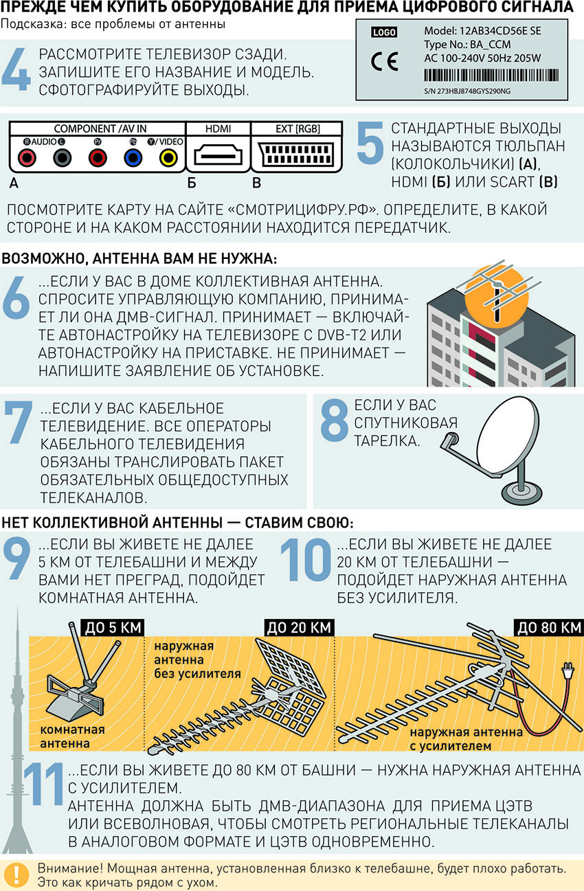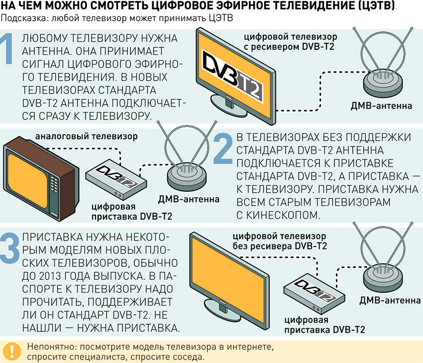 Для того чтобы выяснить, принимает телевизор нужный стандарт вещания или придётся покупать приставку DVB-Т2, «Российская газета» создала инфографики-подсказки.