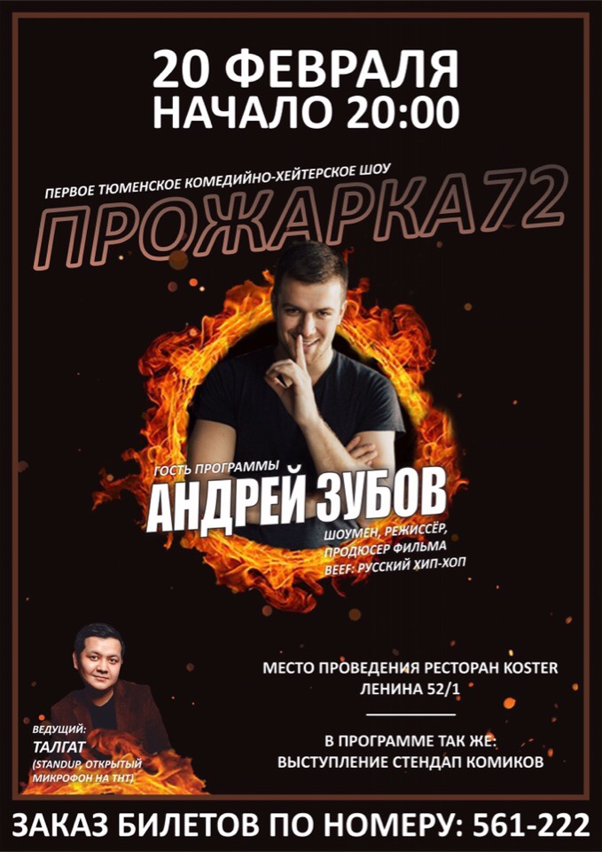 В эту среду главным гостем шоу и объектом «Прожарки» станет режиссёр, продюсер фильма «BEEF: Русский хип-хоп» Андрей Зубов. «Прожарят» его тюменские комики: Руслан Шамухаметов – участник шоу открытый микрофон и «Comedy Баттл» на ТНТ, предприниматель Денис Курышов – участник различных стендап-фестивалей, Сергей Шмидт – сценарист, радиоведущий, Евгений Стасенко – сценарист, КВНщик, Игорь Приписнов – стендап-комик, сертифицированный тренер по фитнесу. Ведущим программы будет участник «Открытого микрофона» и «Stand Up» на ТНТ – Талгат Кожахметов. В этот день также запланировано выступление стендап-комиков.
