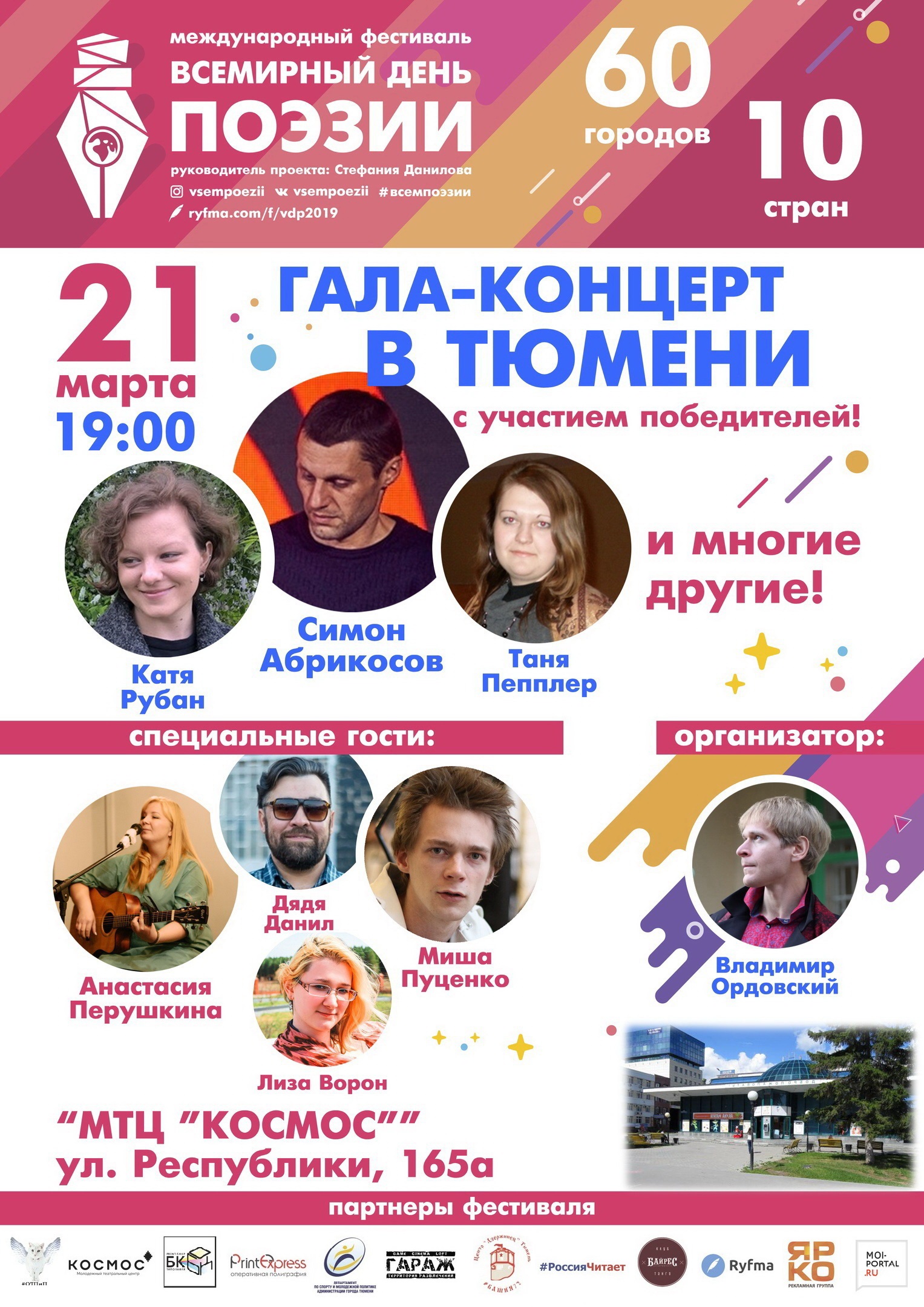По данным организаторов, тюменскими лауреатами международного литературного фестиваля «Всемирный День Поэзии» стало десять человек. Это Симон Абрикосов, Катя Рубан, Таня Пепплер, Сергей Михайлов, Катя Битюкова, Роман Поплавский, Ирина Иванченко, Антон Копытов, Олеся Журавлевская и Мила Романова. Их произведения прозвучат в МТЦ «Космос» 21 марта в 19:00. Кроме выступлений лауреатов и победителей фестиваля на сцену выйдут специальные гости, которые покажут музыкальные номера и прочитают стихотворения классиков, сообщают организаторы.