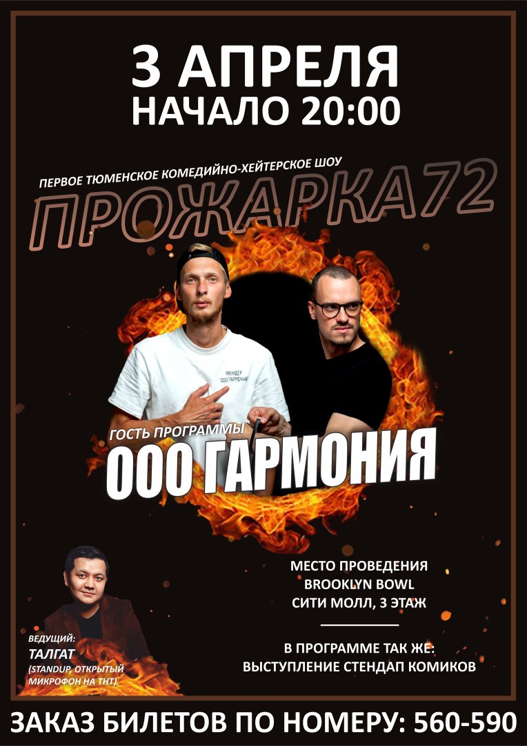 Вряд ли в нашем городе найдется человек, который не слышал о проекте «ООО Гармония». Ролики ребят набирают популярность, о них говорят, а на их вечеринки выстраиваются очереди! 3 апреля в ТРЦ «Сити Молл» в Brooklyn Bowl (3 этаж) они станут главными героями «Прожарки72», где Бориса и Дениса будут открыто высмеивать известные лица Тюмени.