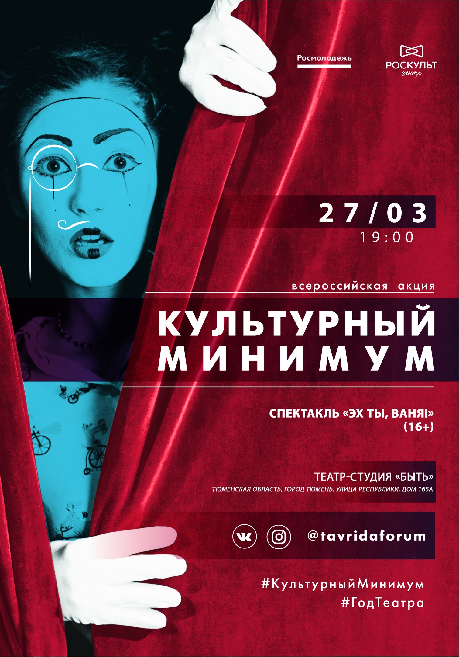 Росмолодежь с 25 по 29 марта проводит акцию «Культурный минимум», в честь Всемирного Дня театра. Суть ее заключается в том, что в эти дни можно бесплатно сходить в театр, на выставку или экскурсию. Тюмень также присоединилась к акции. 27 марта горожане смогут посетить сразу несколько культурных событий в молодежном театральном центре «Космос» (ул. Республики, 165а) бесплатно: открытие выставки про театр, специальный показ спектакля «Эх ты, Ваня!» от театра-студии «Быть» и закрытую читку современной пьесы «С училища». Подробное расписание в тексте ниже.