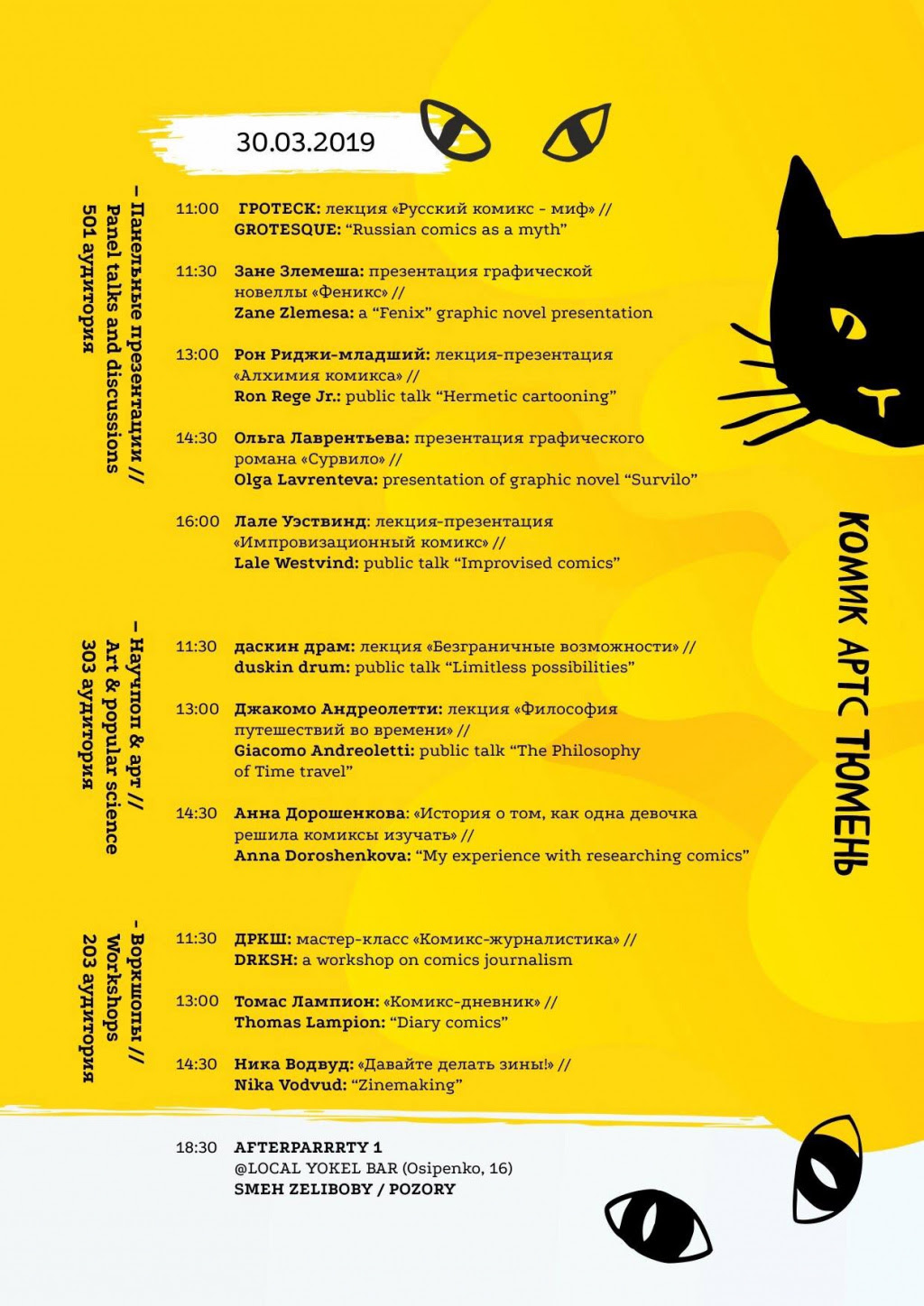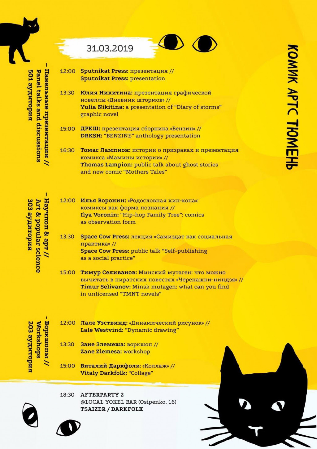 Представителей издательств приедут из Нью-Йорка, Лондона, Лейпцига, Риги, Москвы, Санкт-Петербурга, Воронежа, Тюмени и других городов станут участниками фестиваля. В течение двух дней зрители смогут насладиться не только выставленными комиксами, но и поучаствовать в мастер-классах, прослушать лекции и презентации. Приглашенные спикеры и профессора SAS расскажут о том, как в визуальных искусствах отражается наука и современная культура, научать рисовать собственные истории, самостоятельно издавать и распространять свои работы.