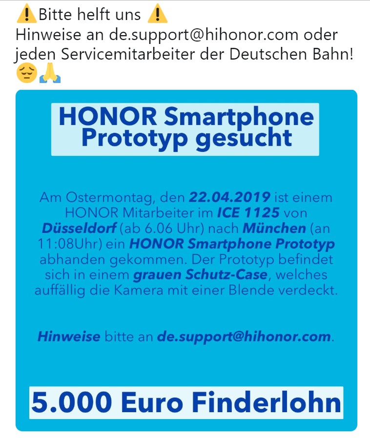 Один из сотрудников отделения Honor, 22 апреля, потерял прототип в поезде, следовавшим по маршруту Дюссельдорфа в Мюнхен. Мориц Шейдл ехал навестить семью на пасхальные праздники. Смартфон был упакован внутри рюкзака, но когда представитель Huawei вернулся домой, то обнаружил, что телефон пропал, пишет Ferra.ru.