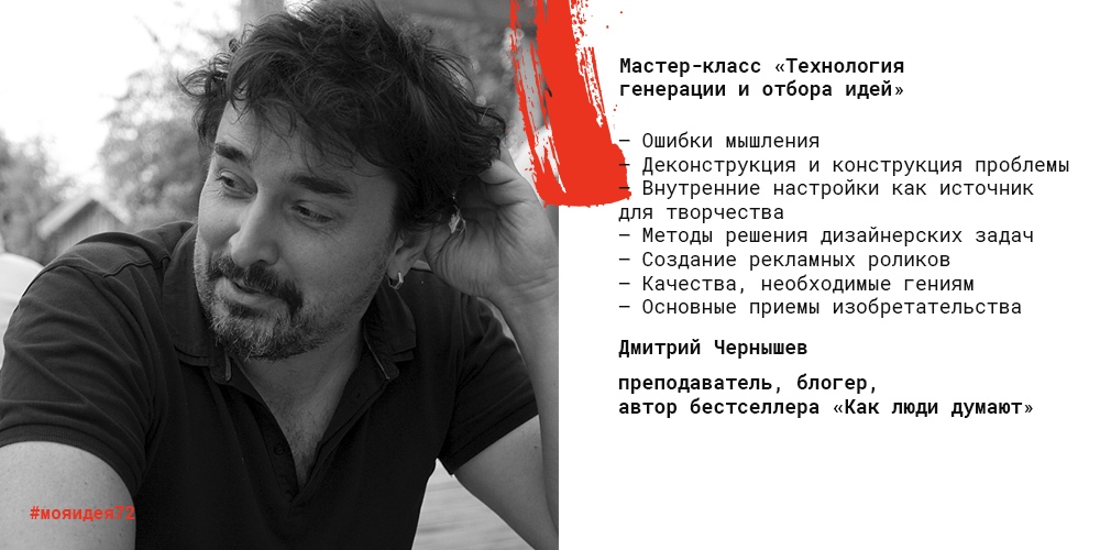 Спикером станет Дмитрий Чернышев, автор бестселлера «Как люди думают», пособия «Как люди видят» и книги «В начале», известный блогер, входящий в ТОП-10 самых популярных блогеров Рунета (ник mi3ch). Дмитрий долгое время работал креативным директором в крупных рекламных агентствах, а также проводил семинары и мастер-классы в Высшей школе экономики, компаниях Microsoft, Deutsche Bank, МТС, X5, Gefco и школе фотографии Photoplay.