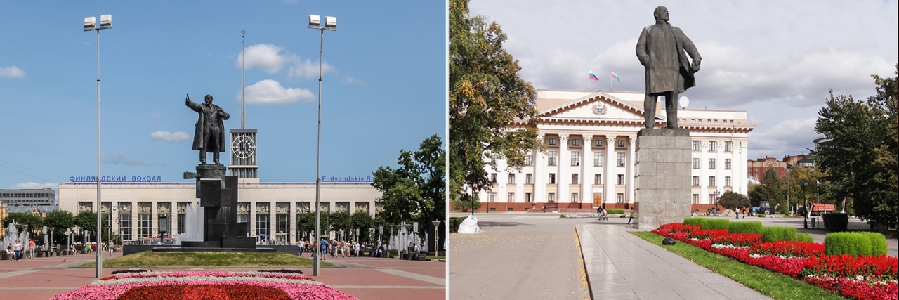 Площадь Ленина на фоне Финляндского вокзала в Санкт-Петербурге и Центральная площадь перед зданием администрации Тюменской области.