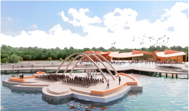 Главным объектом на воде в парке станет плавучая сцена, которая сможет разворачиваться и перемещаться по воде. Вместительность амфитеатра будет рассчитана на семь тысяч человек. Также здесь сделают сцену для проведения танцевальных мероприятий.