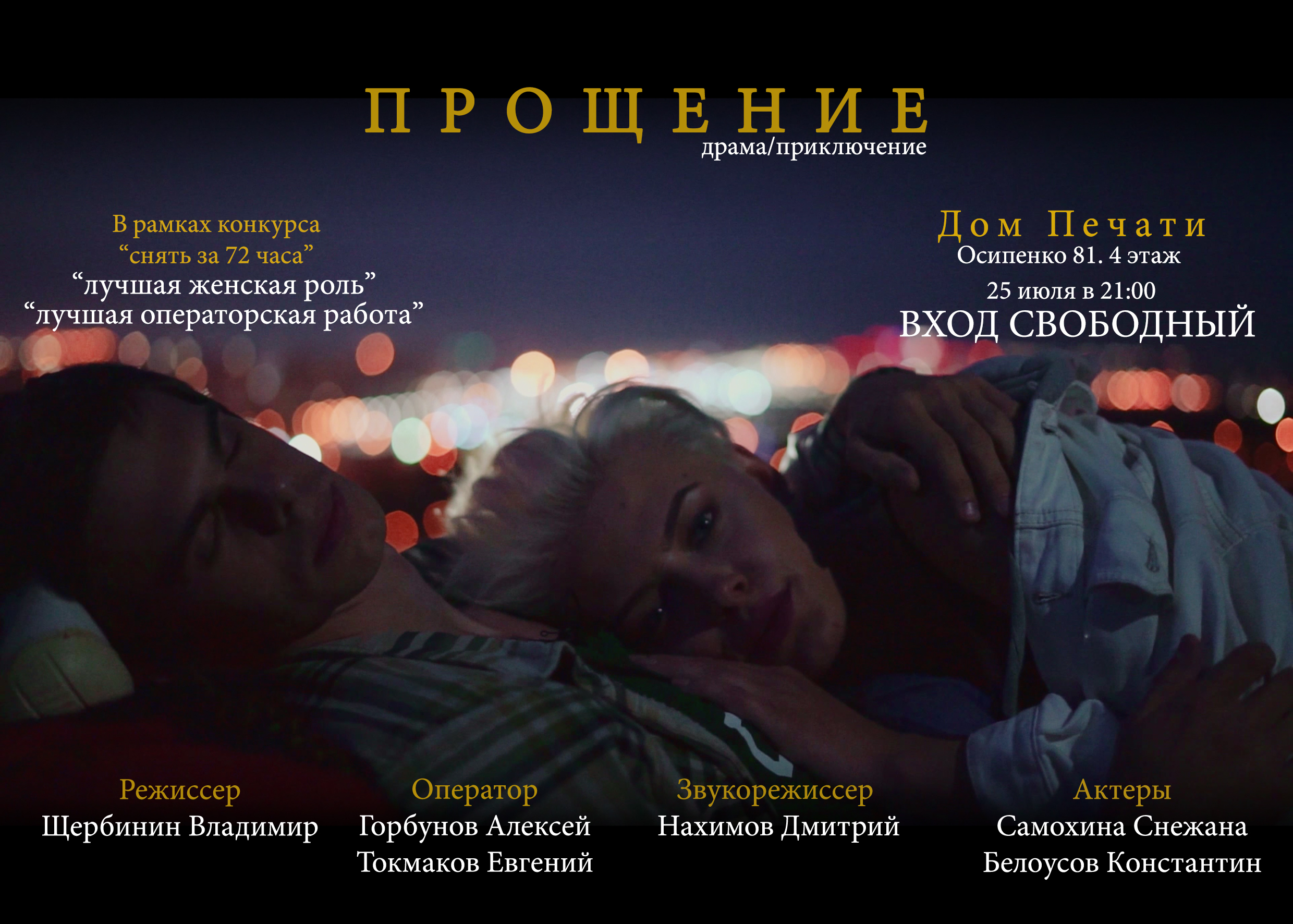 Сегодня, 25 июля, в «Доме печати» (ул. Осипенко, 81, 4 этаж) в 21:00 состоится показ работы команды-участников проекта Центра развития региональных медиа и кино «Медиаполис» - «Снять за 72 часа». Фильм «Прощение» создавался в течение трех дней и основан на реальной истории. В его создании приняли участие – актриса Снежана Самохина, режиссёр Владимир Щербинин, оператор Евгений Токмаков, звукорежиссёр Дмитрий Нахимов, оператор Алексей Горбунов. Также, фильм был отмечен жюри и получил две награды – «Лучшая операторская работа» и «Лучшая актриса».