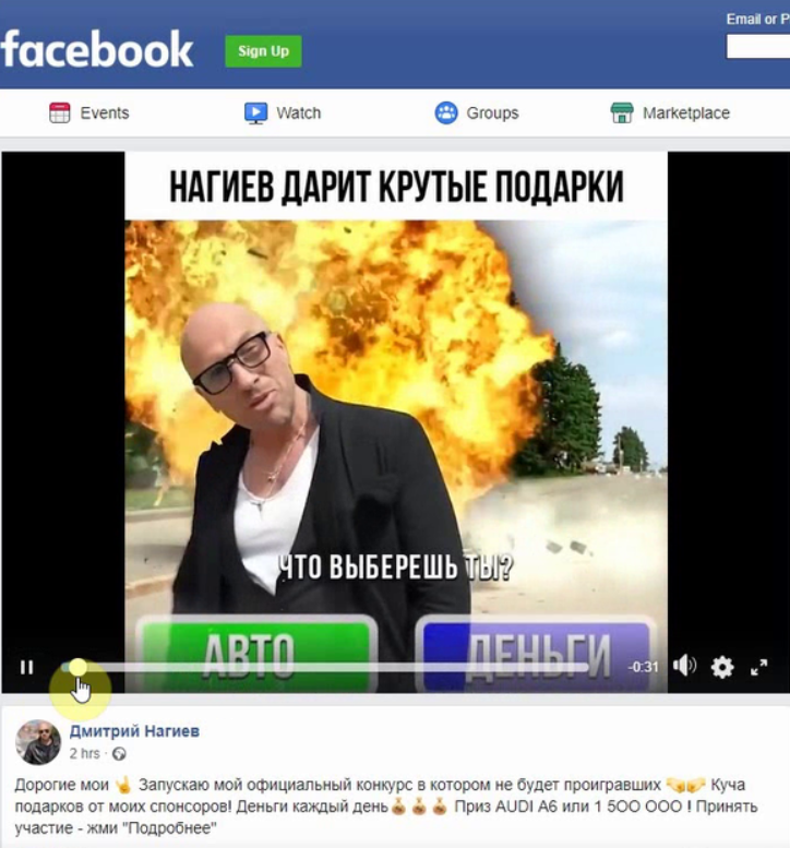 Как сообщает ТАСС, обычному пользователю очень трудно отличить обманное видео. Недавно на данную схему «клюнули» пользователи социальной сети Facebook, где образ популярного телеведущего Дмитрия Нагиева предложил перейти по ссылке на сторонний сайт, чтобы выиграть дорогой автомобиль или полтора миллиона рублей.