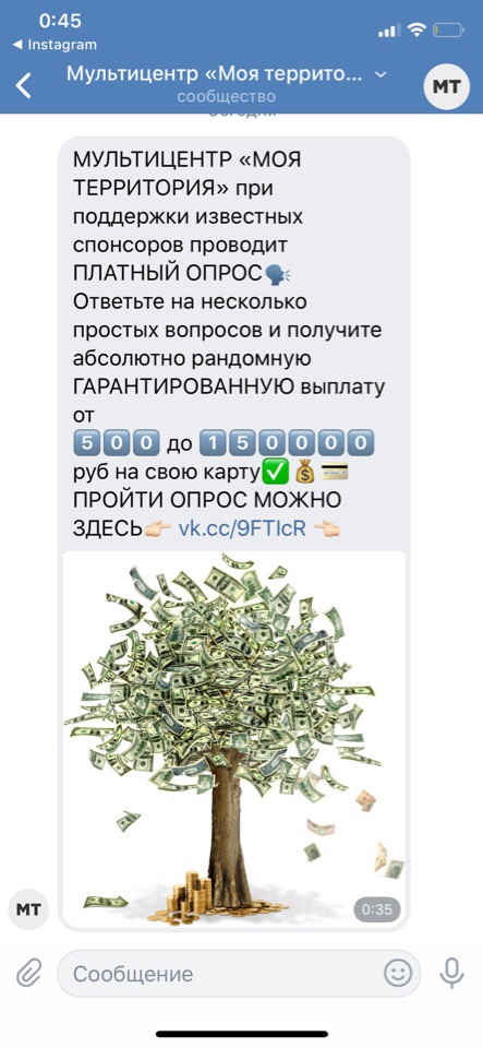 Cегодня ночью, 8 августа, атаке хакеров подверглись тюменские группы мультицентра «Моя территория» и форума «УТРО» в социальной сети «ВКонтакте». В считанные минуты сообщества начали рассылать своим подписчикам сообщения, в которых предлагалось пройти опрос на сайте и получить за это денежное вознаграждение.