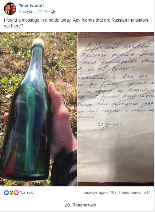 Из текста письма, которое выставил в социальных сетях Тайлер Иванофф, следует, что отправитель служил на «Русском флоте Дальневосточного пароходства» на плавбазе «Сулак».
