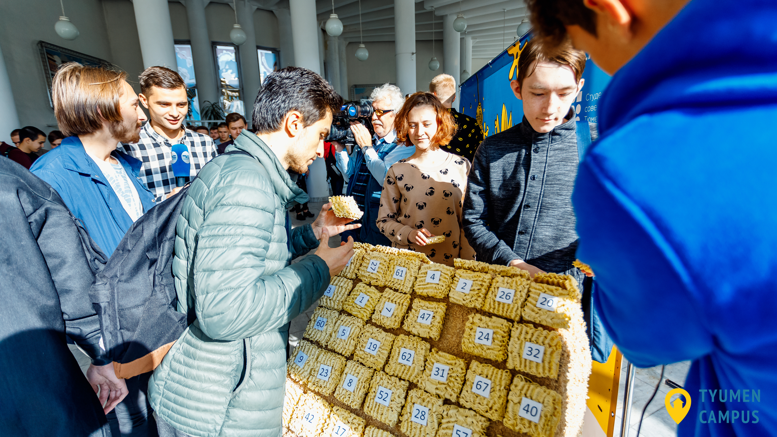 В ходе акции участники брали бруски «доширака» и крепили на макет общежития. Каждому лапшичному кирпичу соответствовал номер, с которым студенты принимали участие в беспроигрышной лотерее. Все, кто присоединился к креативному строительству, получили упаковку лапши быстрого приготовления.