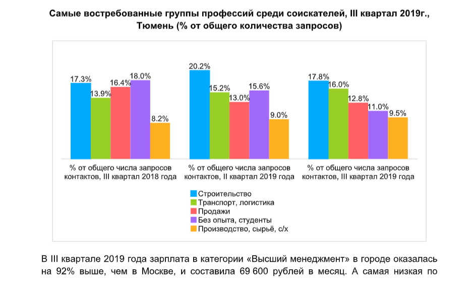«В Тюмени самой высокооплачиваемой сферой среди топ-5 популярных оказалось строительство – среднемесячный оклад составил 46 200 рублей. На втором месте – транспорт и логистика, где средняя зарплата по стране составляет 43 400 рублей. Замыкает тройку лидеров "продажи" со средней зарплатой 32 400 рублей в месяц», — отмечают авторы исследования.