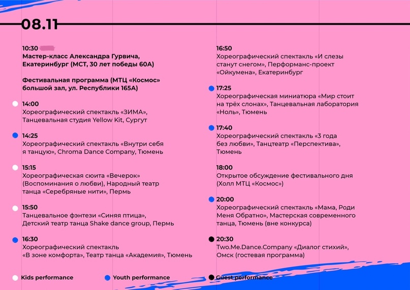 А 9 ноября состоится открытый танцевальный баттл, в нем смогут принять участие все желающие тюменские танцовщики. Вход на все четыре дня фестиваля свободный. Посмотреть выступления можно без билетов и регистрации, достаточно просто прийти в указанное время. С программой можно познакомиться в группе во «ВКонтакте».