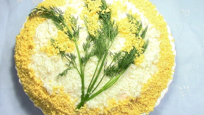 Для приготовления салата потребуется прямоугольная форма, смазанная растительным маслом. Яйцо, картофель, морковь отвариваем. В форму выкладываем салат слоями, промазывая каждый небольшим количеством майонеза, в такой последовательности: сельдь маленькими кусочками, мелко нарезанный репчатый лук, натертые на крупной терке белок, сыр, картофель, морковь. Отделяем салат с помощью ножа от стенок формы и переворачиваем на плоское блюдо. Украшаем по бокам тертым желтком, сверху посыпаем мелко нарезанной зеленью укропа.