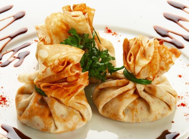 Обжариваем шампиньоны с луком. Затем добавляем сливки, соль, перец, немного тушим. Выкладываем на середину блина начинку из грибов. Складываем блин в виде мешочка и перевязываем пером зеленого лука.