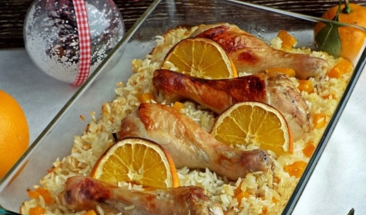 Занимаемся гарниром: промываем рис, очищаем и режем тыкву и лук. На сковородке припускаем нарезку, всыпаем рис и томим 2-3 минуты. В форму, смазанную маслом, перекладываем рис с овощами и куриные ножки. Украшаем ломтиками апельсина. Запекаем в духовке 45 минут при 180 градусах.