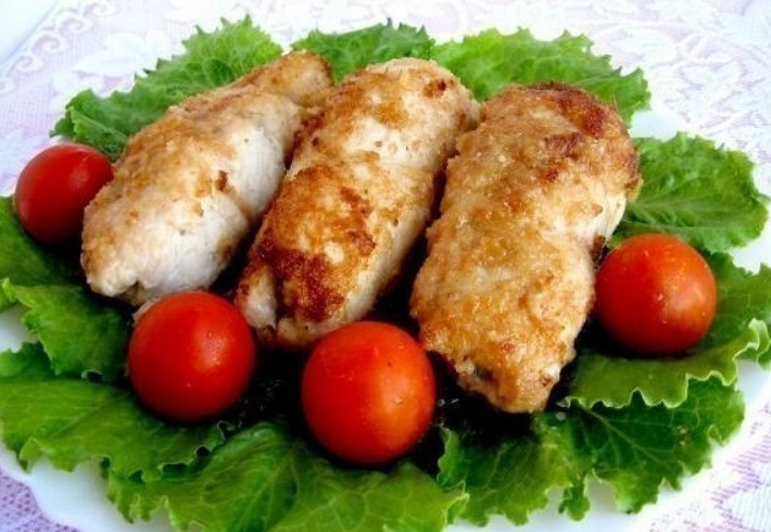 Нарезаем филе на тонкие пластины, отбиваем, посыпаем солью и перцем. Мелко нарезаем шампиньоны и обжариваем их с луком. Натираем на крупной терке сыр. Смешиваем с грибами и выкладываем на куриное филе. Сворачиваем его в плотный рулет, обваливаем в сухарях и закрепляем шпажками или нитями. Запекаем в духовке 20-30 минут при 180 градусах.