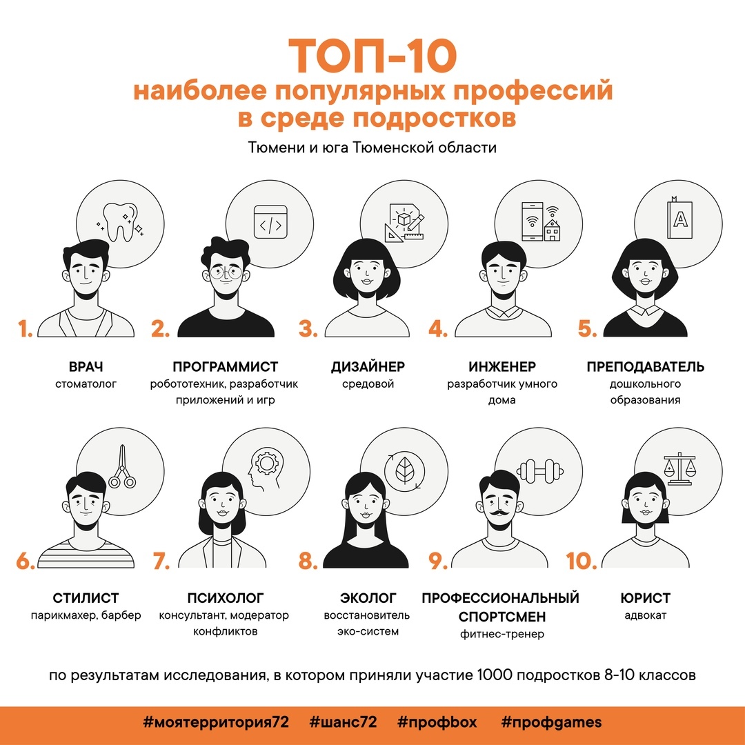 В исследовании приняли участие 1000 учеников из 22 школ. Среди профессий, которые представляют интерес для школьников, лидируют: врач, программист (робототехник, разработчик приложений и игр), дизайнер, инженер (самая популярная специализация — проектировщик умного дома), стилист, преподаватель. Также в топ-10 профессий вошли психолог, эколог, профессиональный спортсмен и юрист.