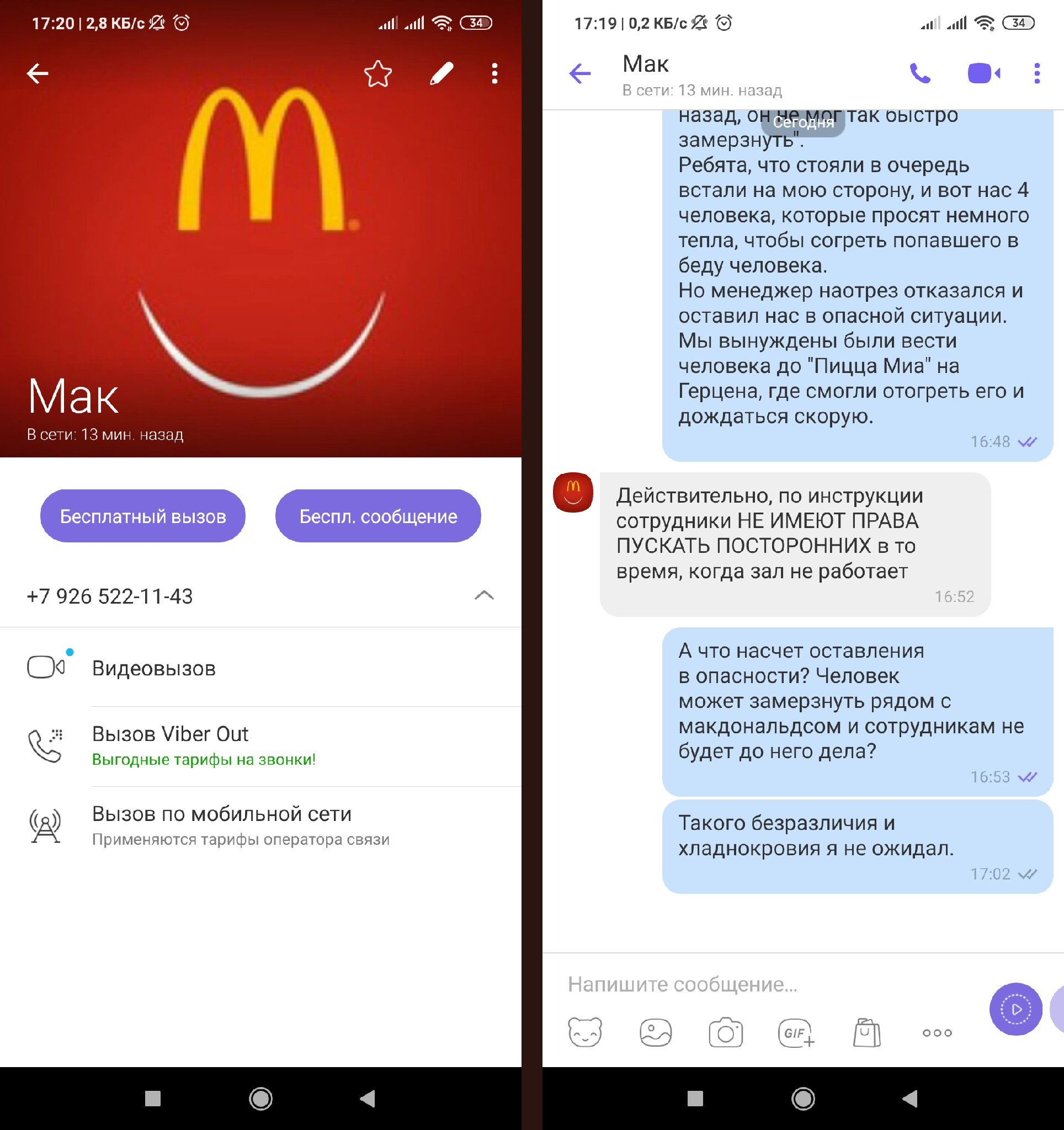 О данном инциденте очевидцы рассказали в паблике «ЧС Тюмень» во «ВКонтакте». По их истории, в 1:15 они с друзьями проходили мимо «Макдональдса» на ул. Ленина. В этот момент к ним, сильно хромая, подошел мужчина и попросил вызвать скорую помощь. Он сообщил, что отморозил ноги, и не может больше идти. Мужчина просил помощи у сотрудников заведения, но те ему отказали, аргументируя это тем, что по инструкции им нельзя впускать посторонних в то время, когда зал не работает.