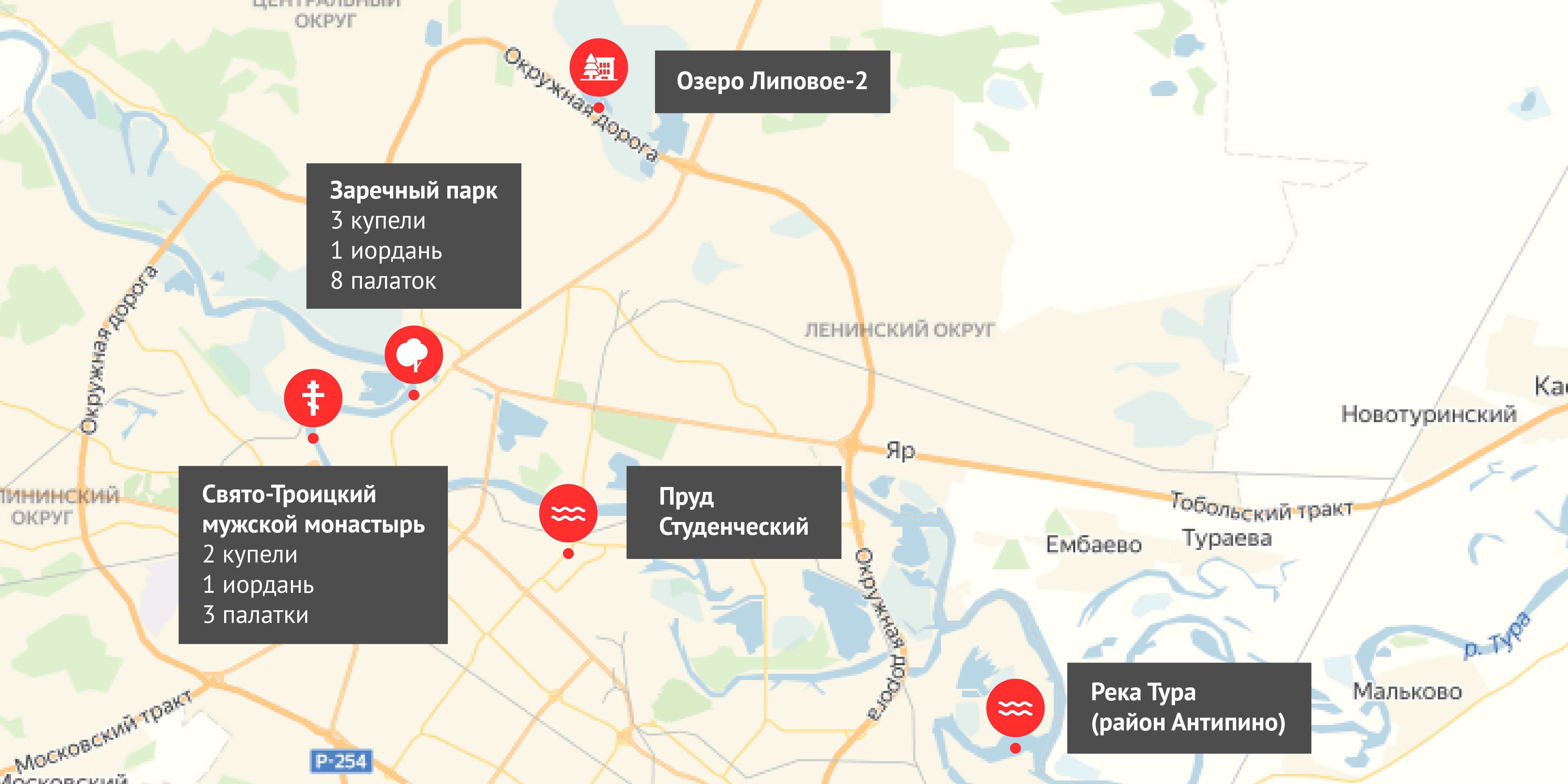 Окунаться в крещенский праздник также будут на озере Липовое-2 (25-й км объездной дороги Тюмени), на пруду Студенческом (ул. Мельникайте, 57/2), на реке Туре в районе Антипино (ул. Высотная, 1, корп. 4, МАУ ДО ДЮСШ «Старт XXI век»). Там тоже организовано дежурство медиков и спасателей, установят палатки для переодевания и купели.