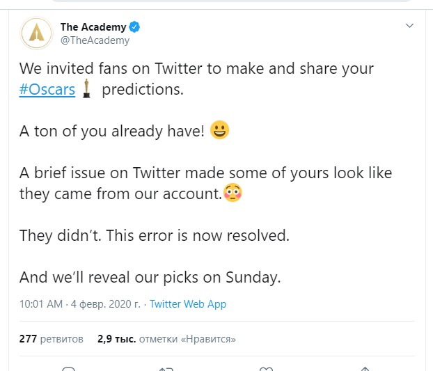 «Мы предложили фанатам поделиться своими прогнозами на "Оскар". И многие уже это сделали! Из-за небольшой проблемы с твиттером некоторые из них выложились так, будто исходили от нашего аккаунта. Но это не так. Ошибка уже исправлена. Наш выбор станет известен в это воскресенье», – написали в твиттер-аккаунте американской Киноакадемии.