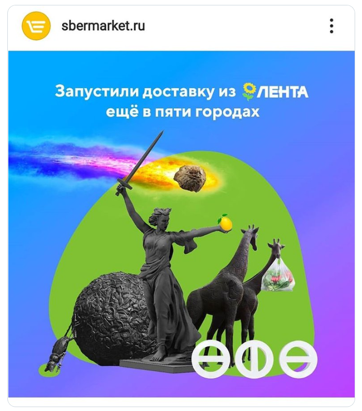 Появившаяся ранее в Instagram реклама с весьма необычным подбором арт-объектов возмутила как простых горожан, так и ветеранов Великой Отечественной войны. На время написания материала пост уже был удален, а сам «СберМаркет» извинился за свою рекламу, где с изображением скульптуры «Родина-мать зовет!» соседствовал жук-навозник.