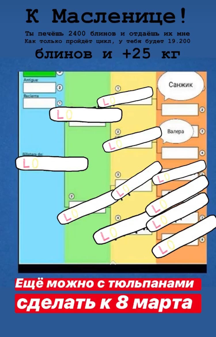 Судя по скриншотам сторис, игра представлена в виде таблицы, поделенной на четыре цветные колонки – синюю, зеленую, желтую, оранжевую. В них вписаны белые таблицы с именами. Чтобы принять участие, необходимо вложить 2400 рублей. По условиям, когда набирается восемь участников в оранжевой колонке, «синий» игрок получает 19200 рублей и выбывает. А на его место продвигаются те, кто находится в зеленой колонке.