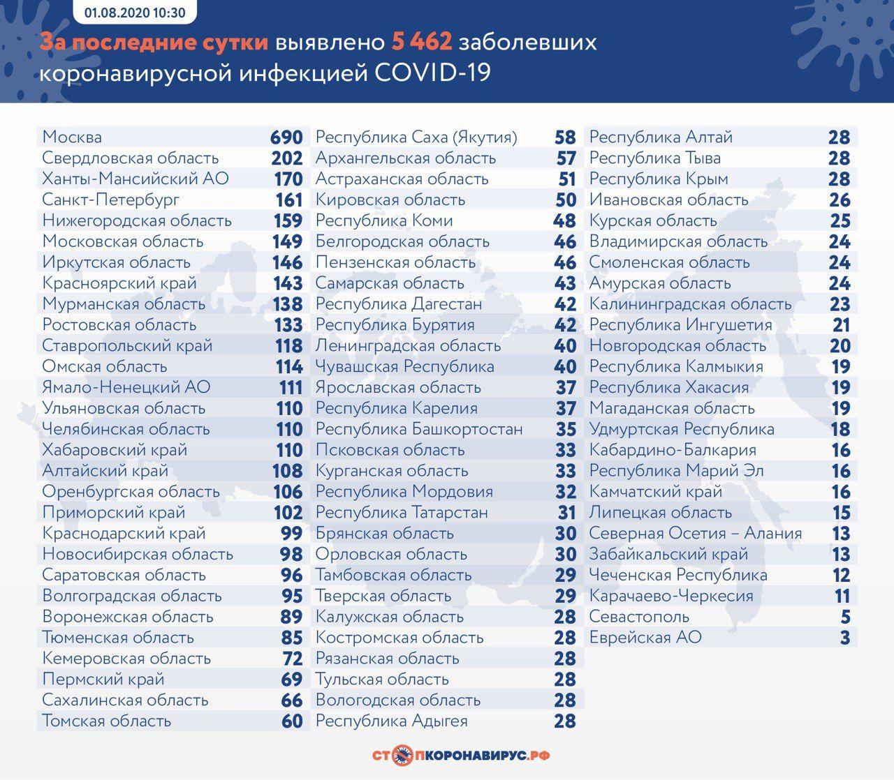 Всего на сегодняшний день в России выявлено 845 443 случая коронавируса в 85 регионах. За весь период зафиксировано 14 058 летальных исходов, выздоровели 646 524 человека.