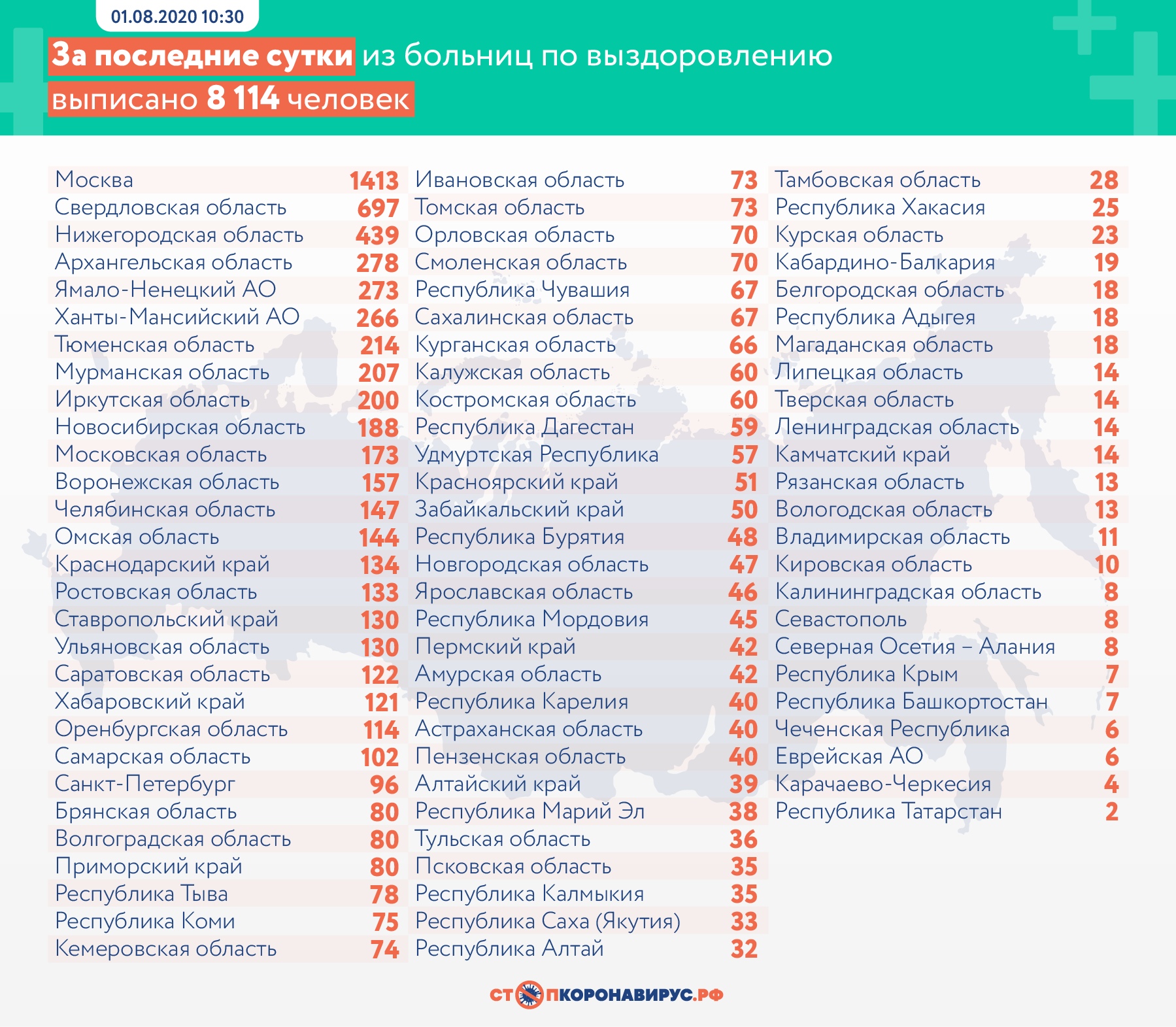 По данным федерального оперштаба, заболевших нашли в 83 регионах, 24,8% не имели клинических проявлений болезни. Всего за сутки вылечилось 8 114 человек, 95 человек не справились с болезнью.